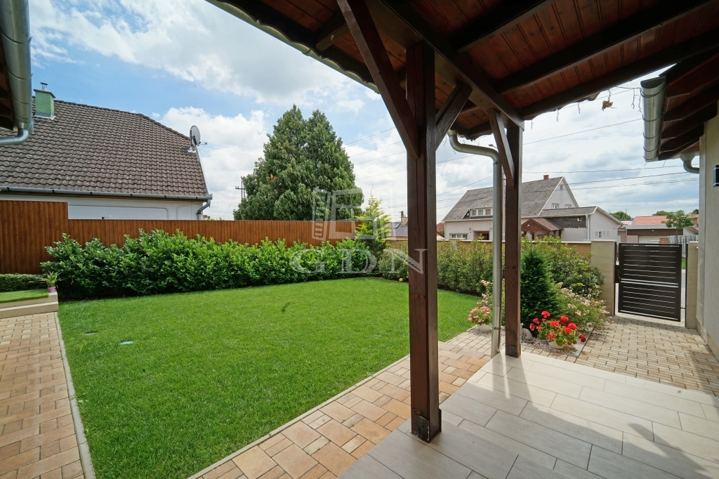 A parkosított kertet öntözőrendszer locsolja helyettünk. A megközelítőleg 70m2-es fedett terasz kiválló helyszíne a családi összejöveteleknek és a pihenésnek. Az itt található jacuzzi is a vételár részét képezi.