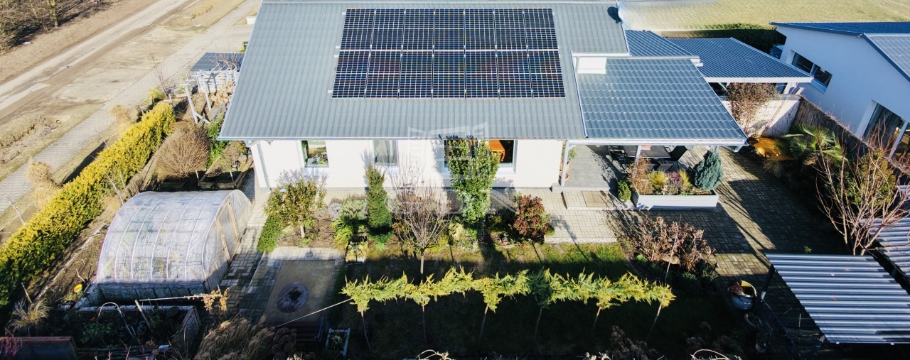 Fő szempont a megújuló energia kihasználása. A meleg víz és a fűtés is elektromos rendszerrel került kialakításra, melyet egy 5,2 kwh napelemrendszer biztosít. Szaldós elszámolással rendelkezik 2031-ig. Az éves napelem termelés fedezi az egész ház energia szükségletét.