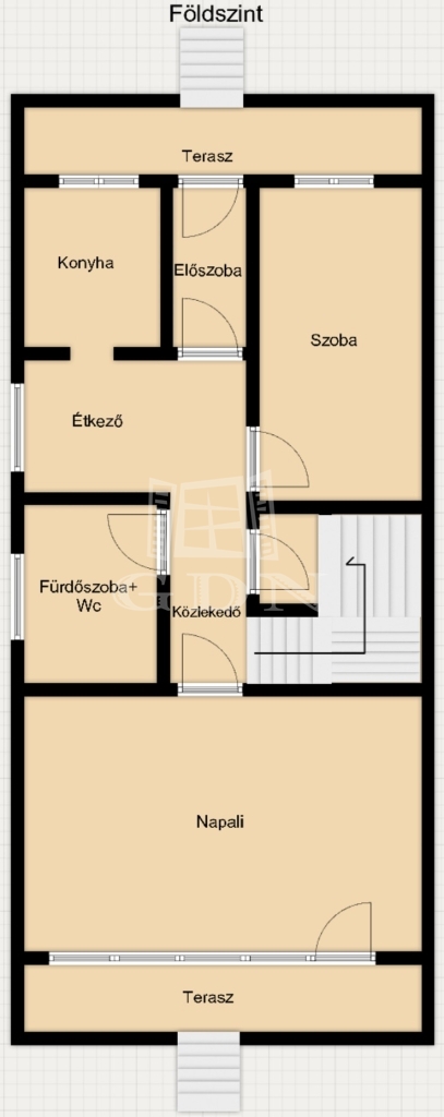 - A házba az utcáról egy 6 m²-es teraszon keresztül lépünk be az előszobába.