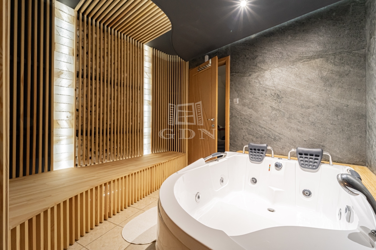 A ház különlegessége a saját wellness szint, ahol egy szauna, jakuzzi és sófallal ellátott pihenőtér is helyet kapott – tökéletes kikapcsolódás az év bármely napján. Emellett összesen 5 szoba és 4 fürdőszoba szolgálja a kényelmet, köztük egy teljes szülői lakrész panorámás terasszal.
