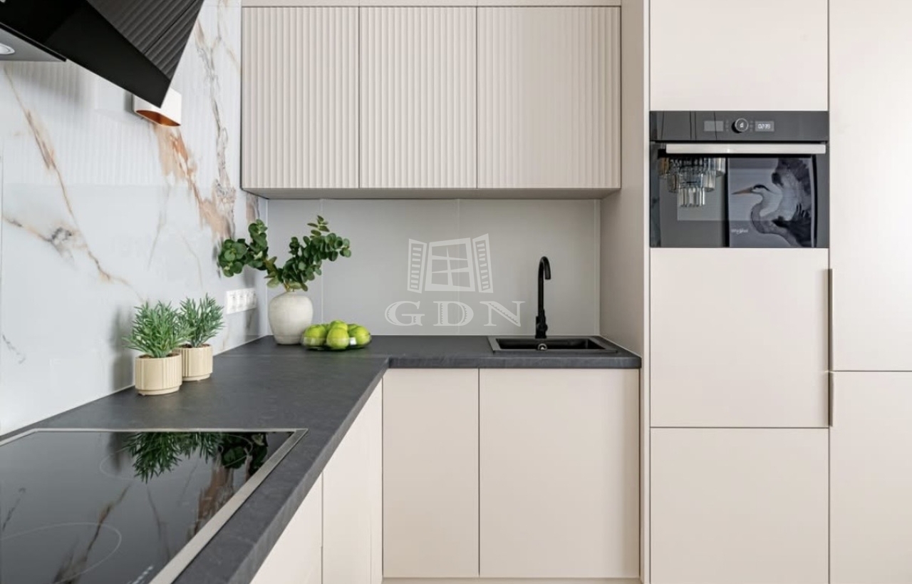 A tágas nappali, az elegáns hálószoba, a külön walk-in gardrób, valamint a modern, prémium anyagokkal kialakított konyha és fürdőszoba együtt teremtik meg a letisztult luxus atmoszféráját.