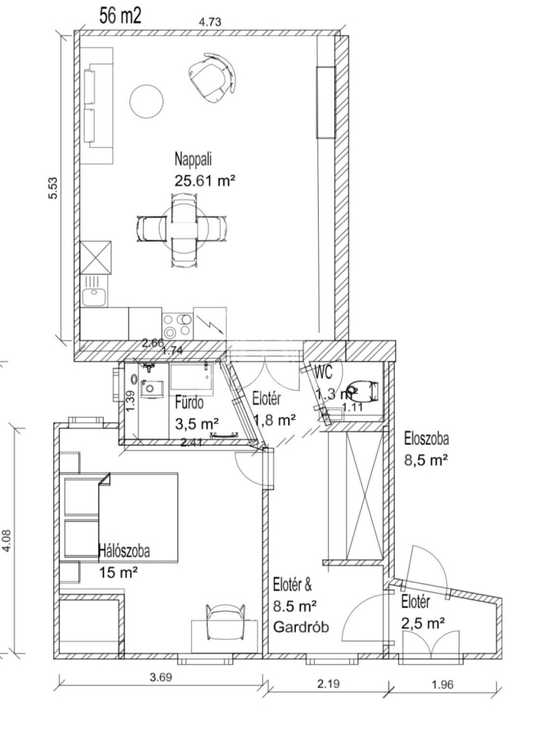 56 m2Alapterület 2 + 1 Szoba