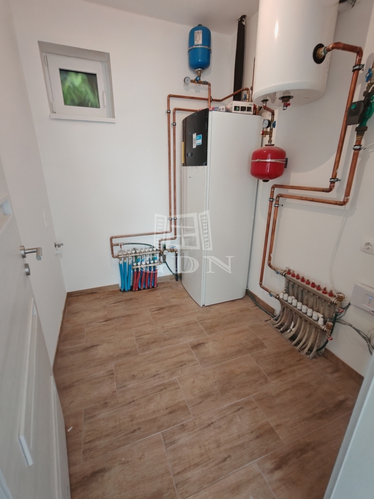 Háztartási helyiség, ahol helyet kapott a mosógép kiállás és szárító gépnek is van hely valamint a Daikin hőszivattyú.