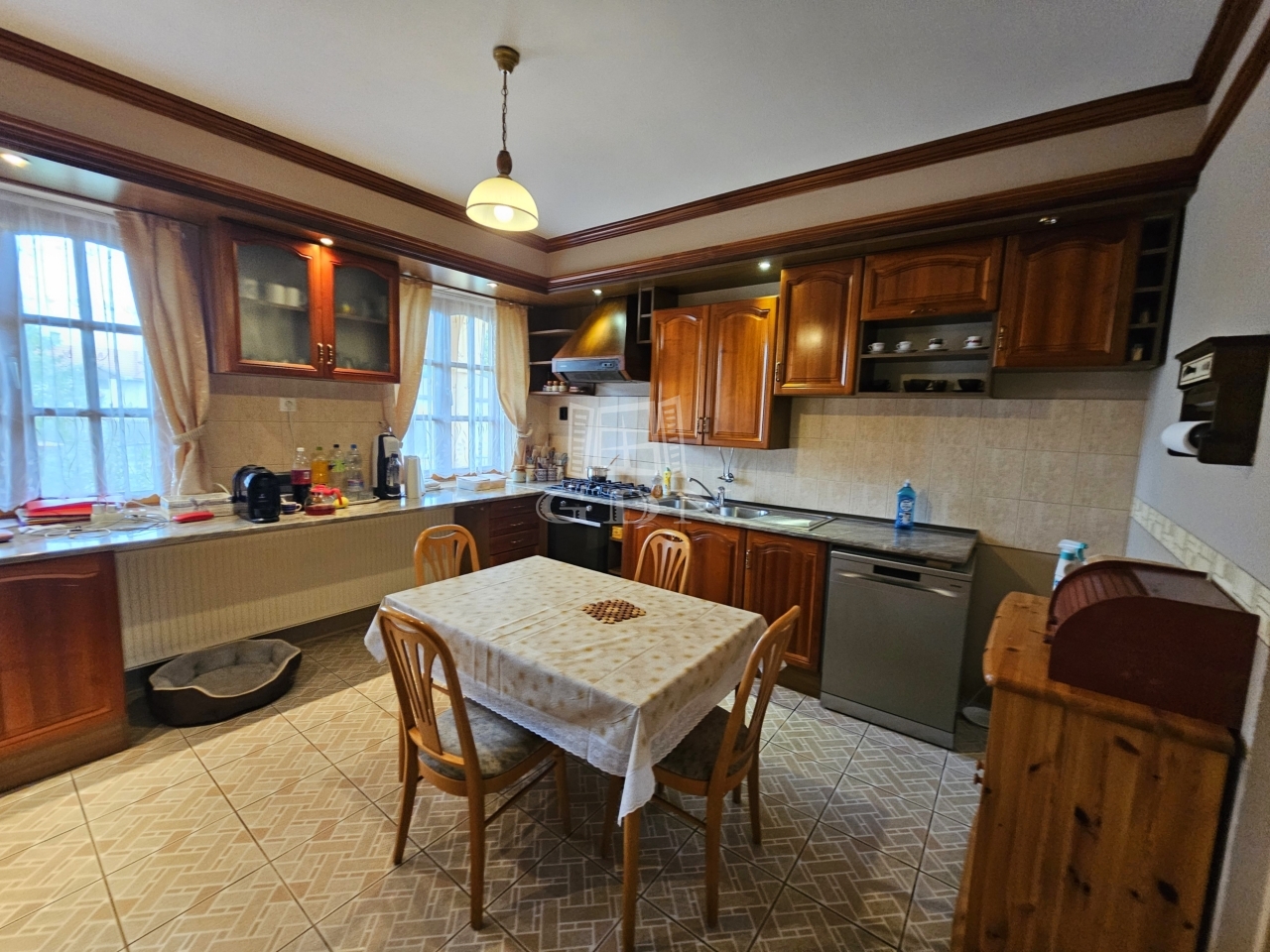 A konyha világos, elegáns kivitelű, praktikusan elrendezett, teljesen gépesített, az étkezővel átadó pulttal is össze van kötve. Az étkezőrész és a nappali tágas, a rajta található tolóajtón keresztül a nagy teraszra is ki lehet ülni.