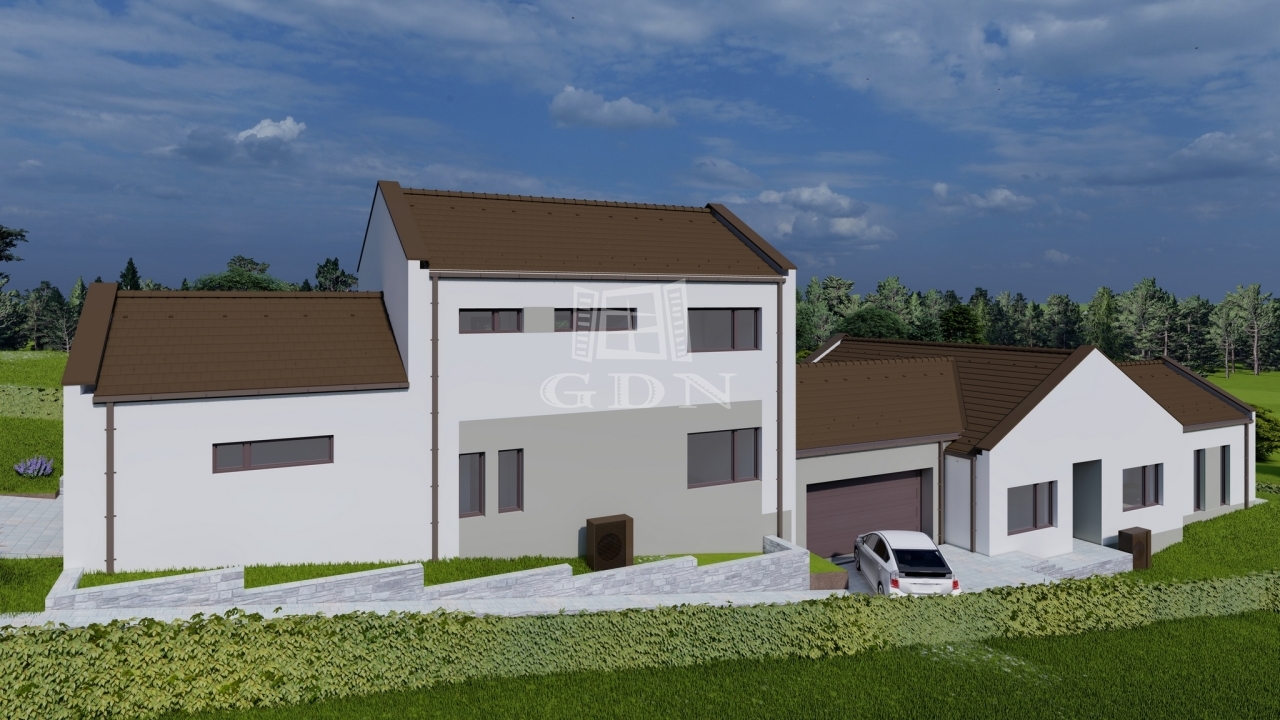 Veresegyház, Hegyek városrész csendes, kertvárosias részén, cca. 650 nm-es telek területtel, Új építésű, bruttó 176 nm-es, 5 szobás (nappali + 4 hálószoba, külön konyha, étkező), egy szintes, vasbeton födémes, hőszivattyús (levegő - vízes) padló fűtéssel, Dél - Nyugati fekvésű, műanyag thermo dió színű (3 rétegű, 7 légkamrás) nyílászárós, szigetelt (15 cm dryvit), új építésű, a másik féltől teljesen elszaparált, dupla garázzsal elválasztott, a másik lakóegységgel egy telken lévő, de külön, elválasztott úton megközelíthető családi ház (hátsó) eladó.