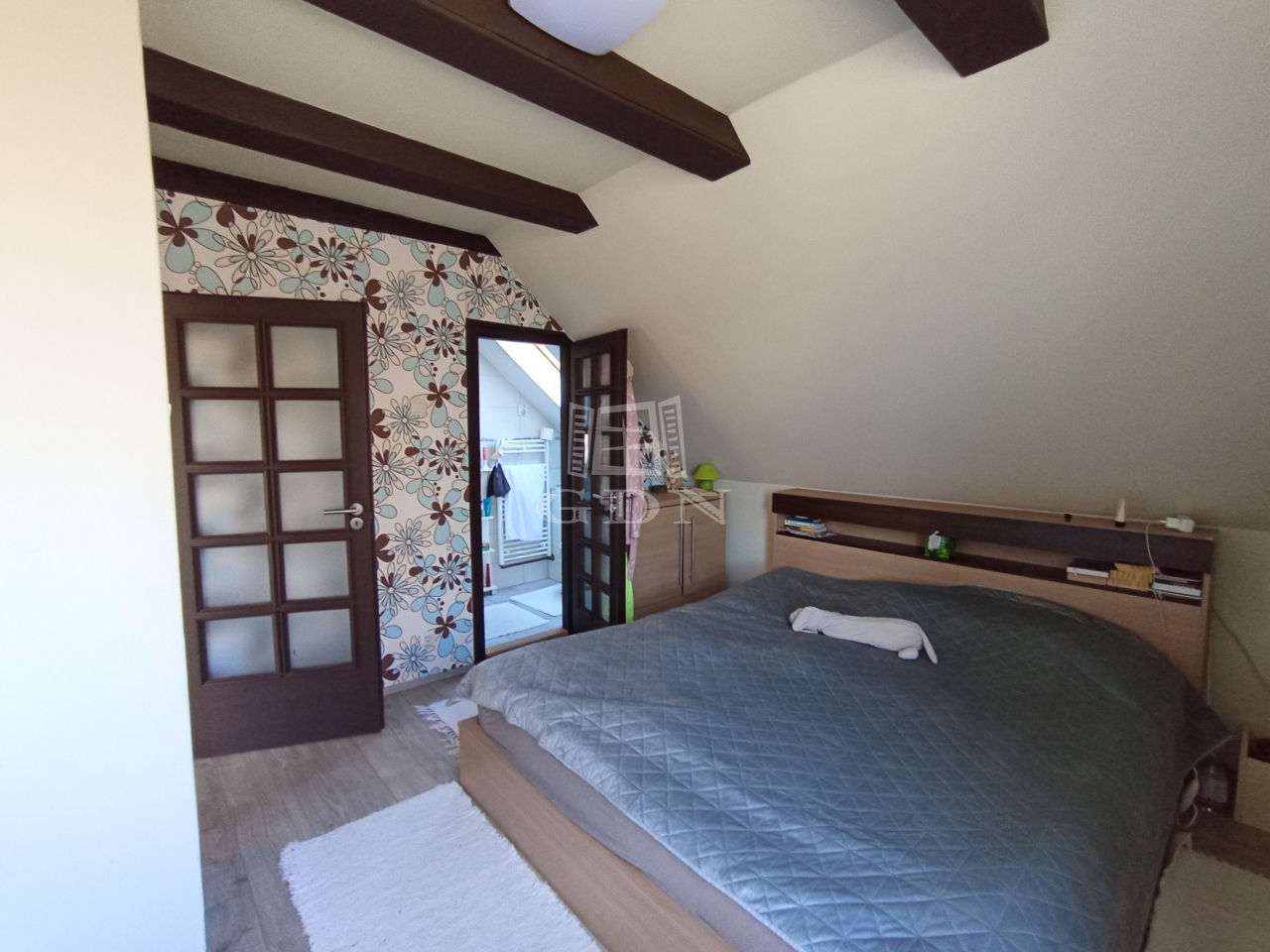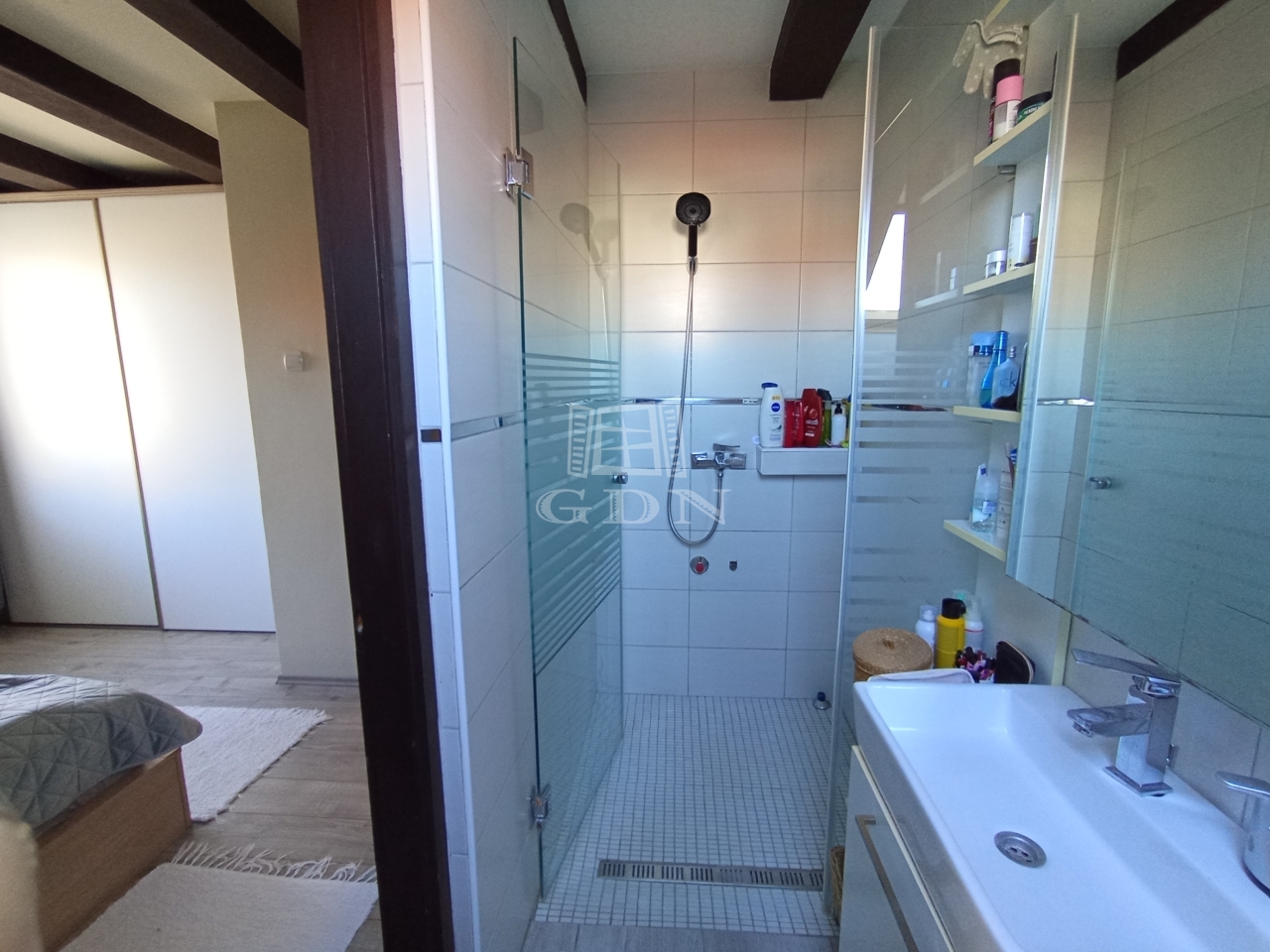 Felső szint: nappali, amerikai konyhás étkező, 3 hálószoba, 2 fürdő WC-vel (egyik zuhanyzós, közvetlen kapcsolattal a hálóhoz), erkély várpanorámával