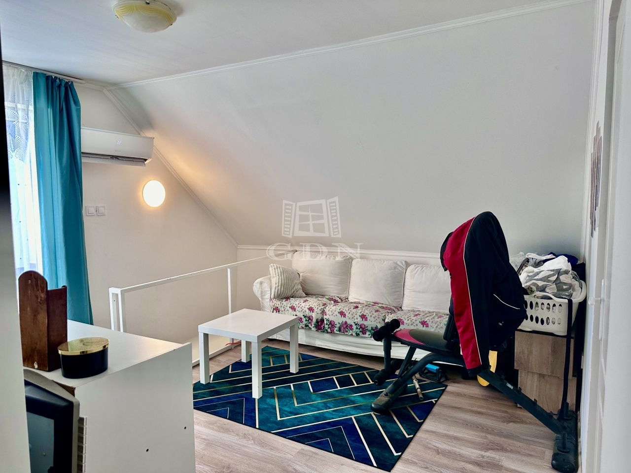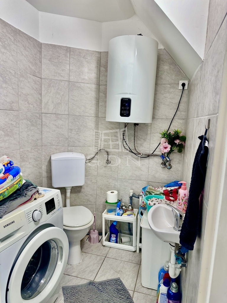 Az első lakrészbe belépve egy tágas, beépített konyhabútoros konyha étkezővel fogad minket! Innen nyílik egy wc ami háztartási helyiségként is funkciónál, itt található a mosógép, valamint egy korszerű bojler is. Ebből a helyiségből tudunk felmenni a felső szintre. Az emeletre felérve, egy kis nappaliba érkezünk, ahonnan nyílik egy tágas, káddal ellátott fürdőszoba, valamint 2 szoba és egy kis közlekedő. A kisebb szobából egy erkélyre is kiléphetünk.