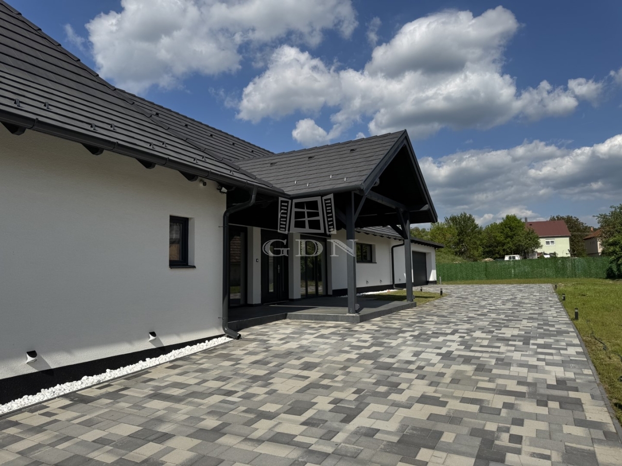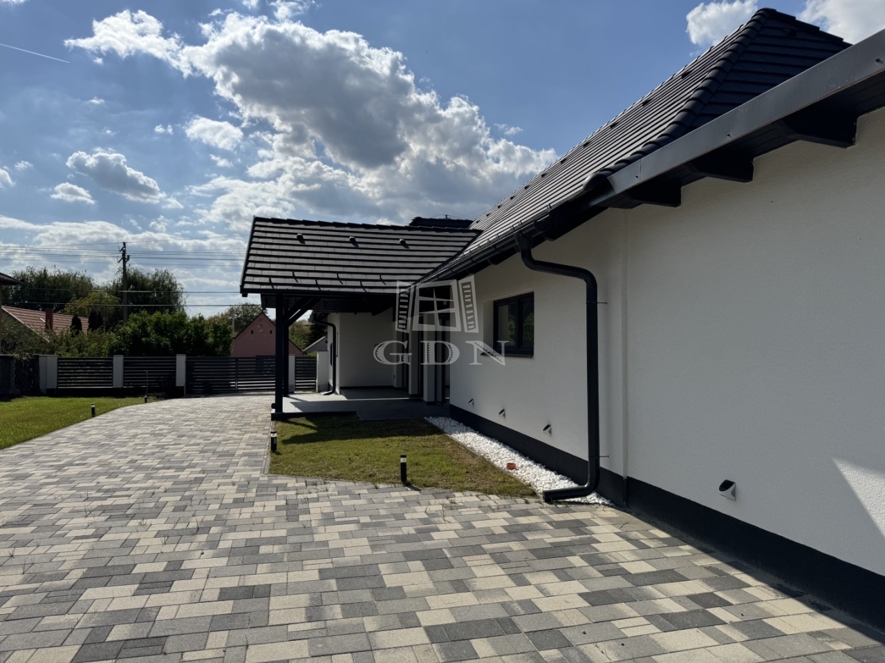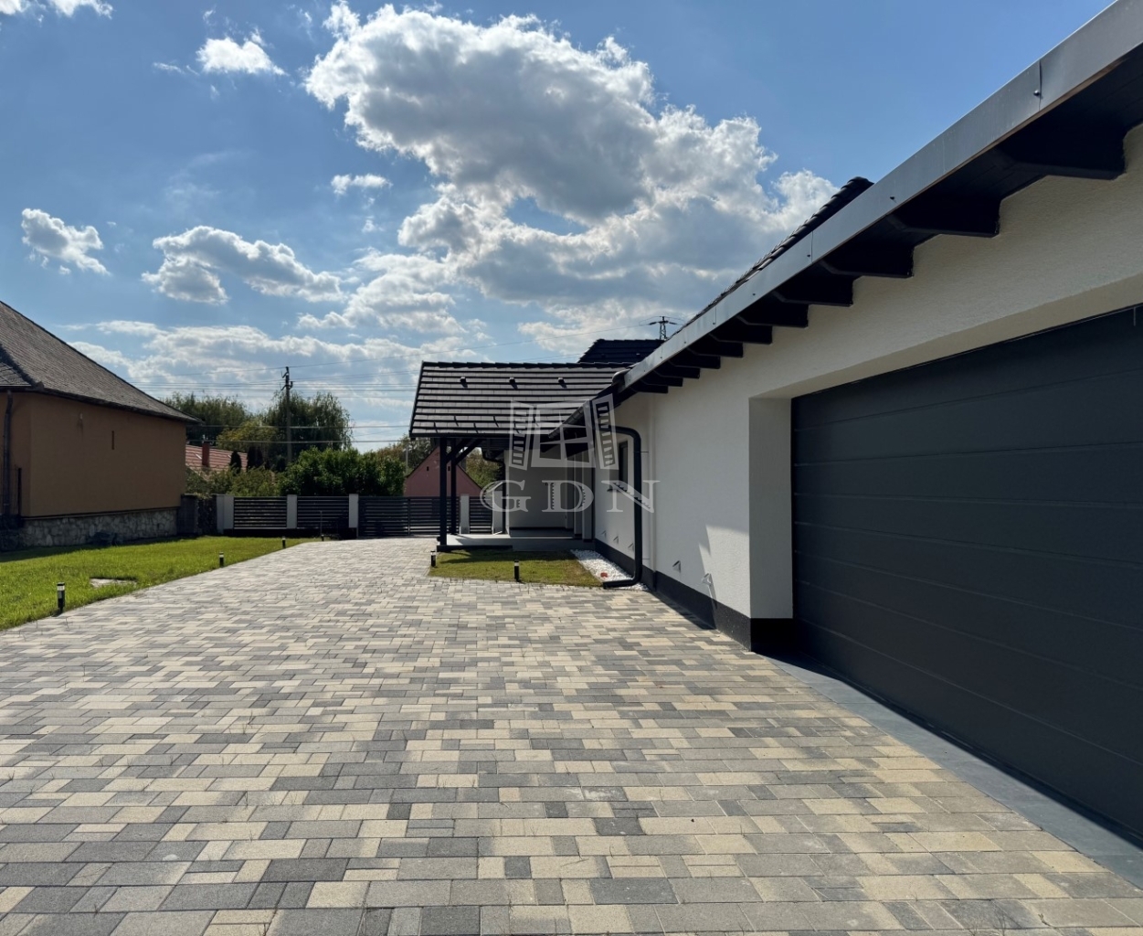 A telek 900 m2-es, teljesen körbekerített, részben térkövezett, részben füvesített.