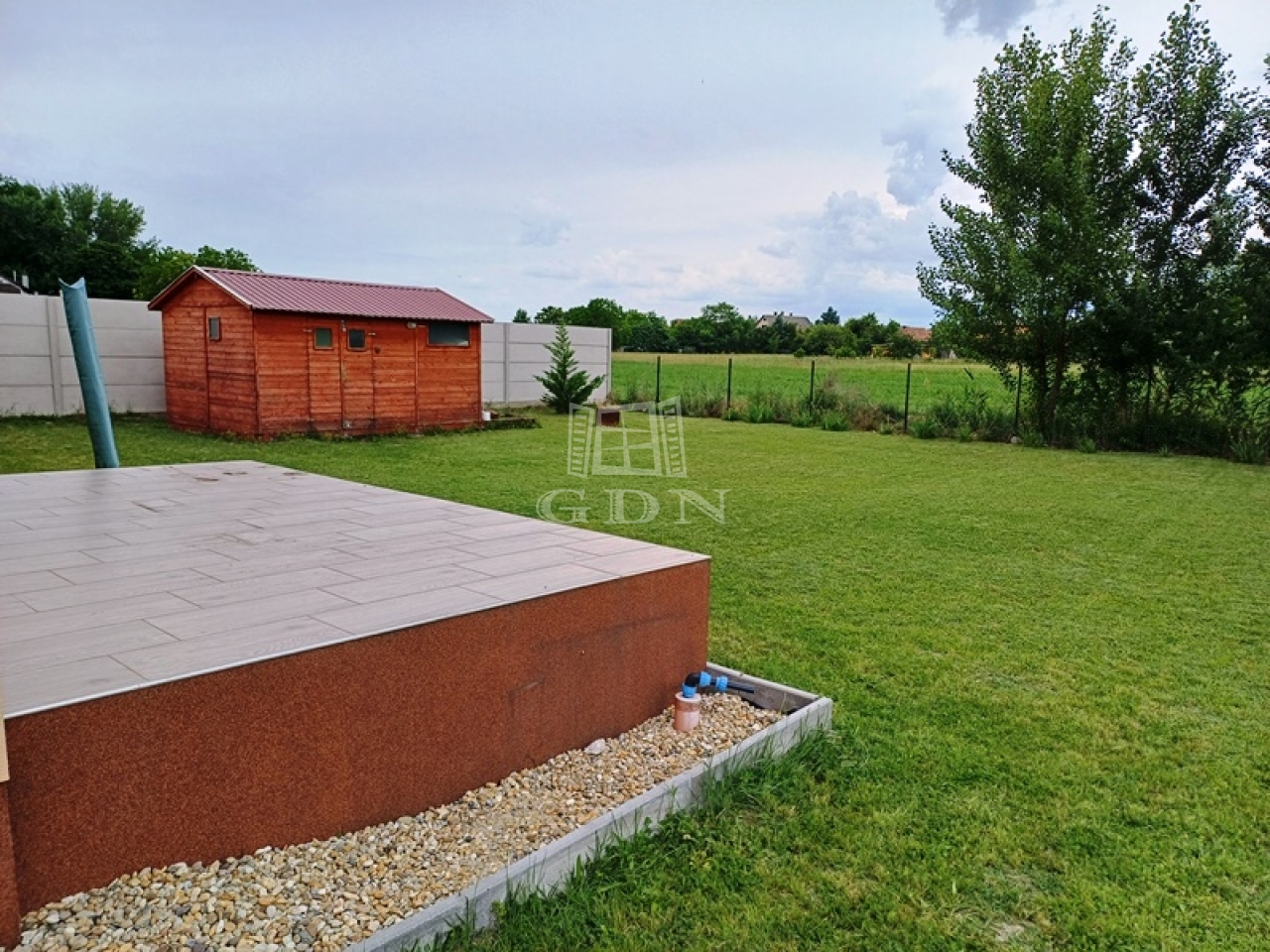 A kert rendezett, öntözése fúrt kútról biztosított, a kerti szerszámok tárolására 12 m2 kerti tároló épült.