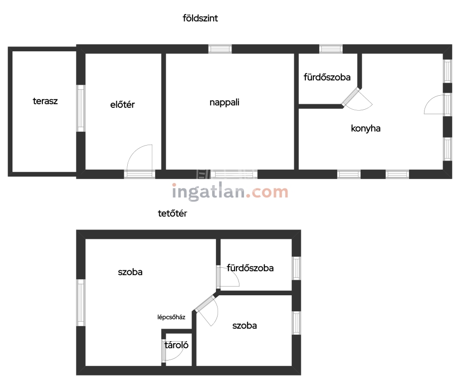 Helyiségei:alsó szint, előtér, nappali, konyha/étkező, fürdőszoba zuhannyal, fedett terasz, felső szint, 2 szoba, fürdőszoba, tároló.