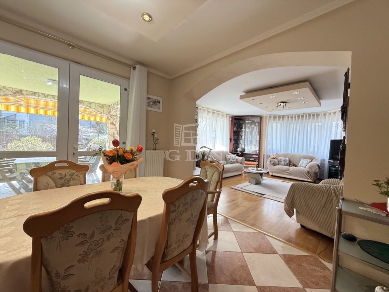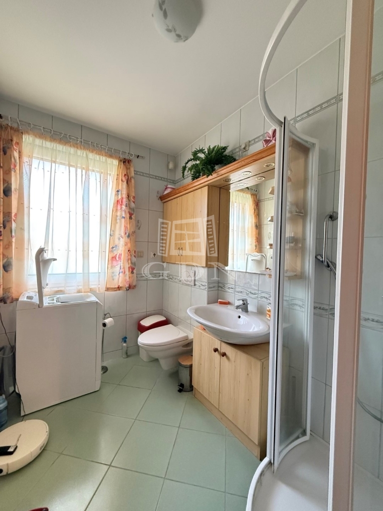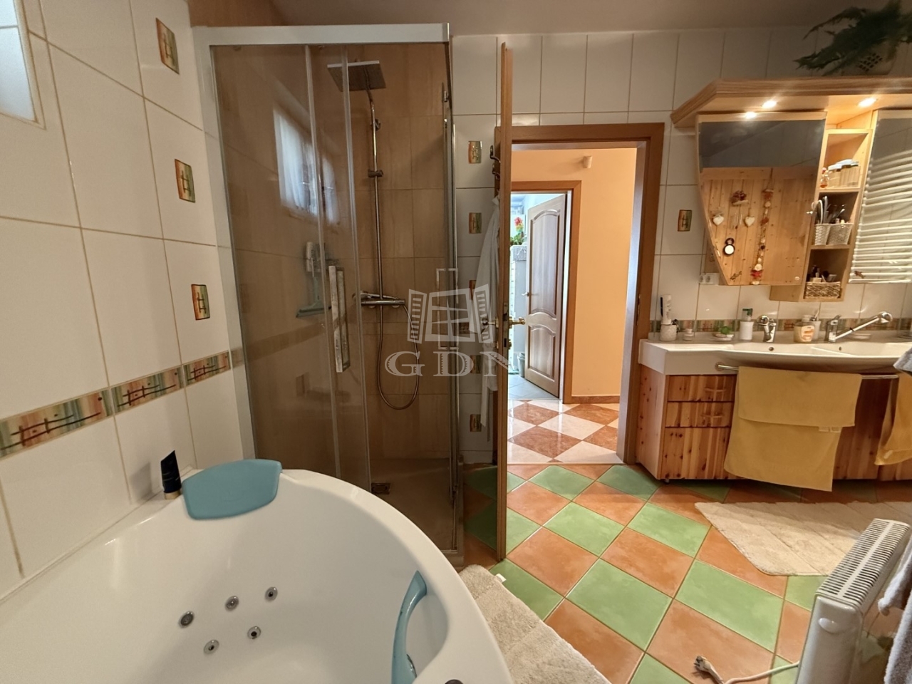 Földszint : Az előtér a ház központi terébe nyílik, a bejárati ajtótól jobbra egy- akár külön választható lakrészként- 1 hálószoba, előszoba, fürdő wc-vel helyezkedik el, közvetlen bejutással a minden funkcióval felszerelt konyhába. A bejárati ajtótól balra van a garázs (külön bejárattal), és az előszobából balra egy kamra. A bejárati ajtóval szemben az előszobából az étkezőbe jutunk , itt található még a földszinten egy tágas világos nappali, 1 gardrób, egy fürdő wc-vel, szaunával, háztartásihelyiség, vendég wc, és egy hálószoba.