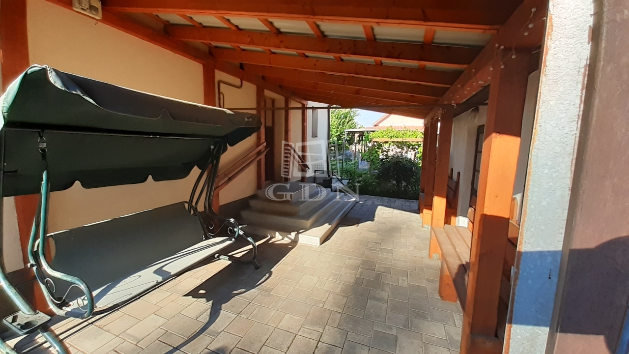 A szépen karbantartott zöld területen megtalálható egy szőlőlugas, kis állatoknak akár külön terület, rengeteg fa és termések, ami még szebbé teszi a telket. A telken még található egy nagy fedett terasz (28 nm), amely összeköti a két épületet, ami természetesen térkövezet.