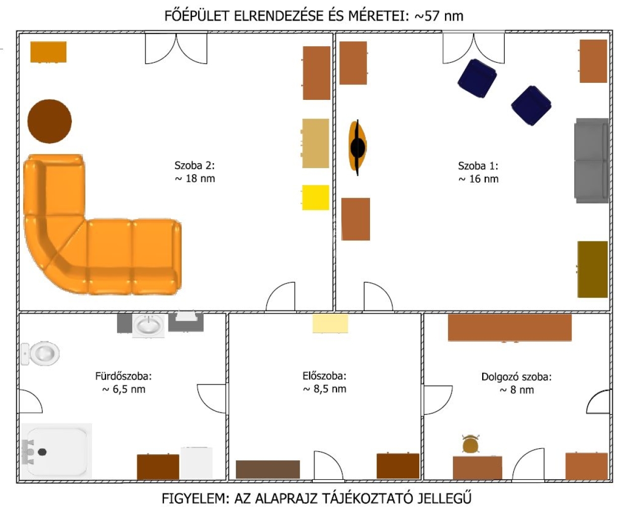 A főépület hasznos alapterülete 57 nm, melyben található: