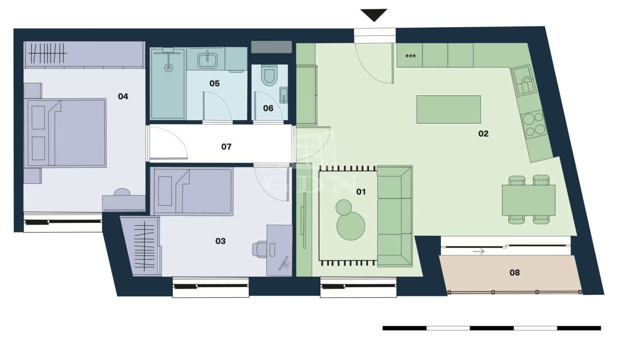A 6 emeletes társasház 1. emeletén található ez a piacon keresett két hálószobás összkomfortos, ingatlan. A központi tér a közel 33m2-es konyha -nappali melynek nyugati frontján, nagy toló ajtókkal határolja az erkélyről mely tavasztól, őszig a nappali kiterjesztése. Az átgondolt tervezésnek köszönhetően nagyszerűen elkülönülnek a hálószobák nappalitól.