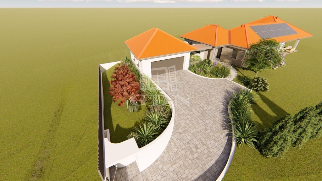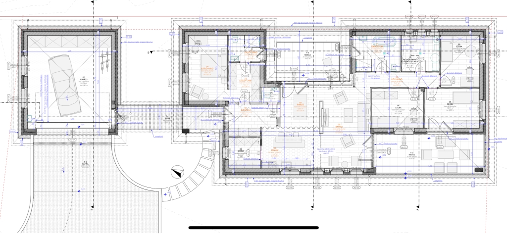- A homlokzati falak: Porotherm 30 cm N+F téglafal. A belső válaszfalak 10 cm es Porotherm N+F téglából épülnek. A falak felett hőhídmentes (+5cm XPS szigetelés) zsaluzott vasbeton koszorú, a nyílászárók felett előregyártott PTH, vagy monolit vasbeton áthidaló