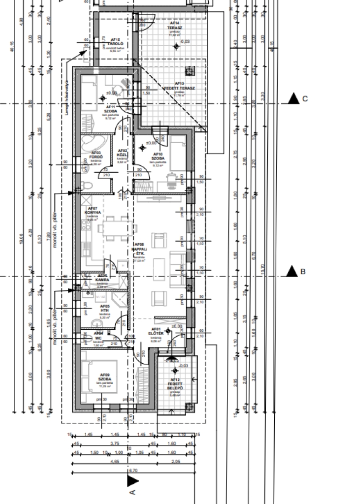 Helyiségei: nappali/étkező 27,00 m2, szoba 11,25 m2, szoba 9,12 m2, szoba 9,12 m2, konyha 5,25 m2, fürdő szoba 5,28 m2, közlekedő 3,52 m2, előtér 6,06 m2, kamra 2,34 m2, wc 1,50 m2, hth 5,20 m2, fedett belépő 5,48 m2 fedett terasz 11,79 m2, terasz 11,40 m2, tároló 5,55 m2.