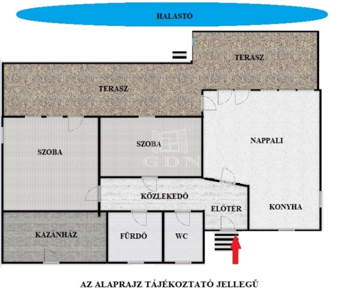 Ingatlan elosztása: nappali+konyha (33m2), szoba (9,5m2), szoba (11m2), közlekedő (8,3m2), fürdő (4,7m2), wc (2,2m2), terasz (41m2)