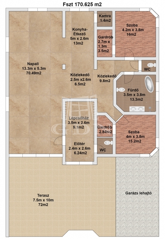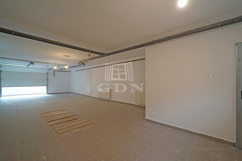 Parkolás az elektromos garázsajtóval szerelt, 13.3 méter hosszú és 5.2 méter széles, 67.66m2-es garázsban lehetséges.
