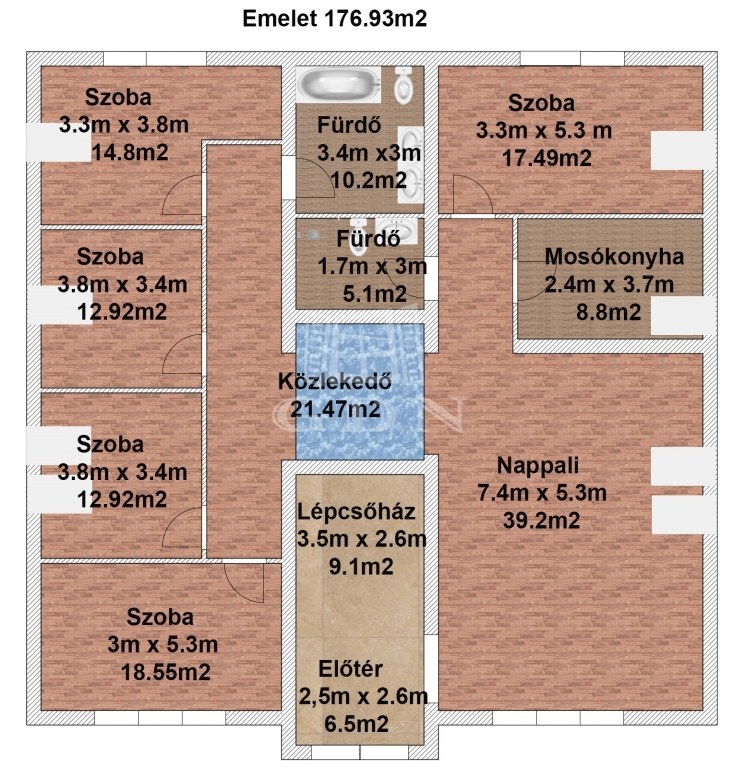 Külön kazán biztosítja a szuterén szinten elhelyezkedő 8x3,6 méteres 185 cm mély medence fűtését.