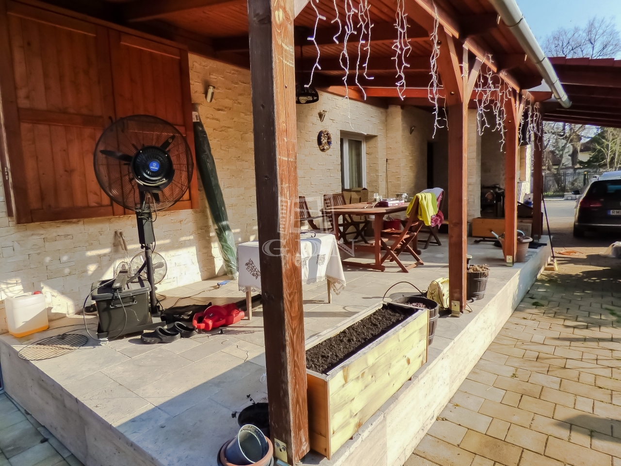 A fedett felszíni beálló elektromos kapun keresztül közelíthető meg, viakolor borítású, továbbá a zárt udvaron belül cca. 5 autó is elfér.