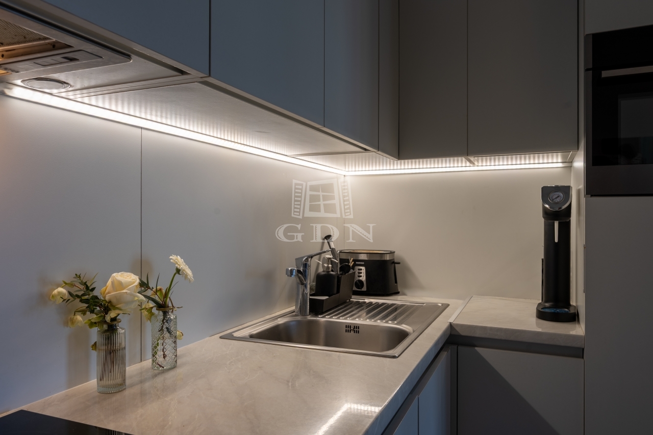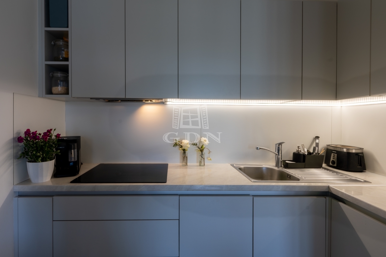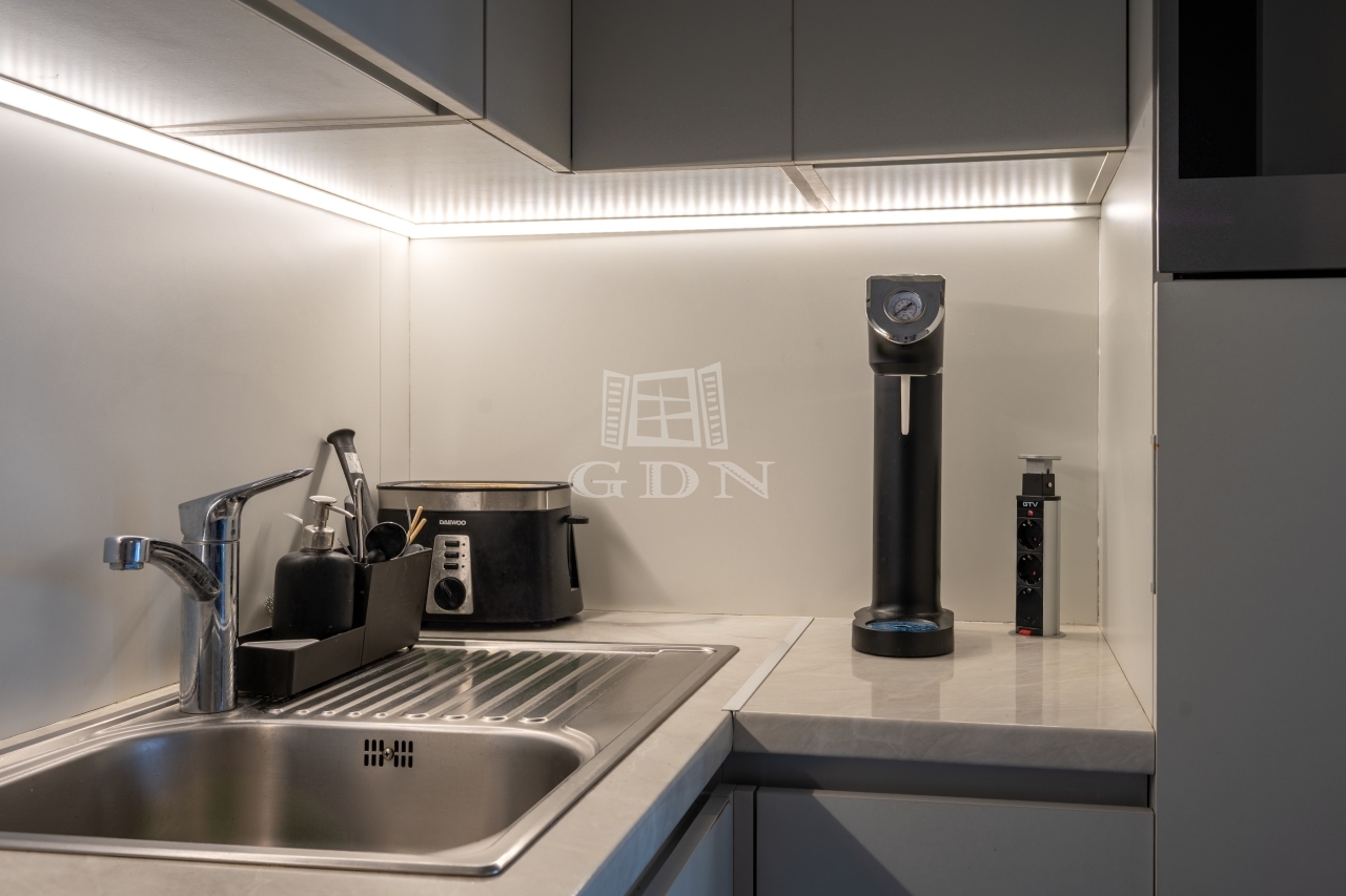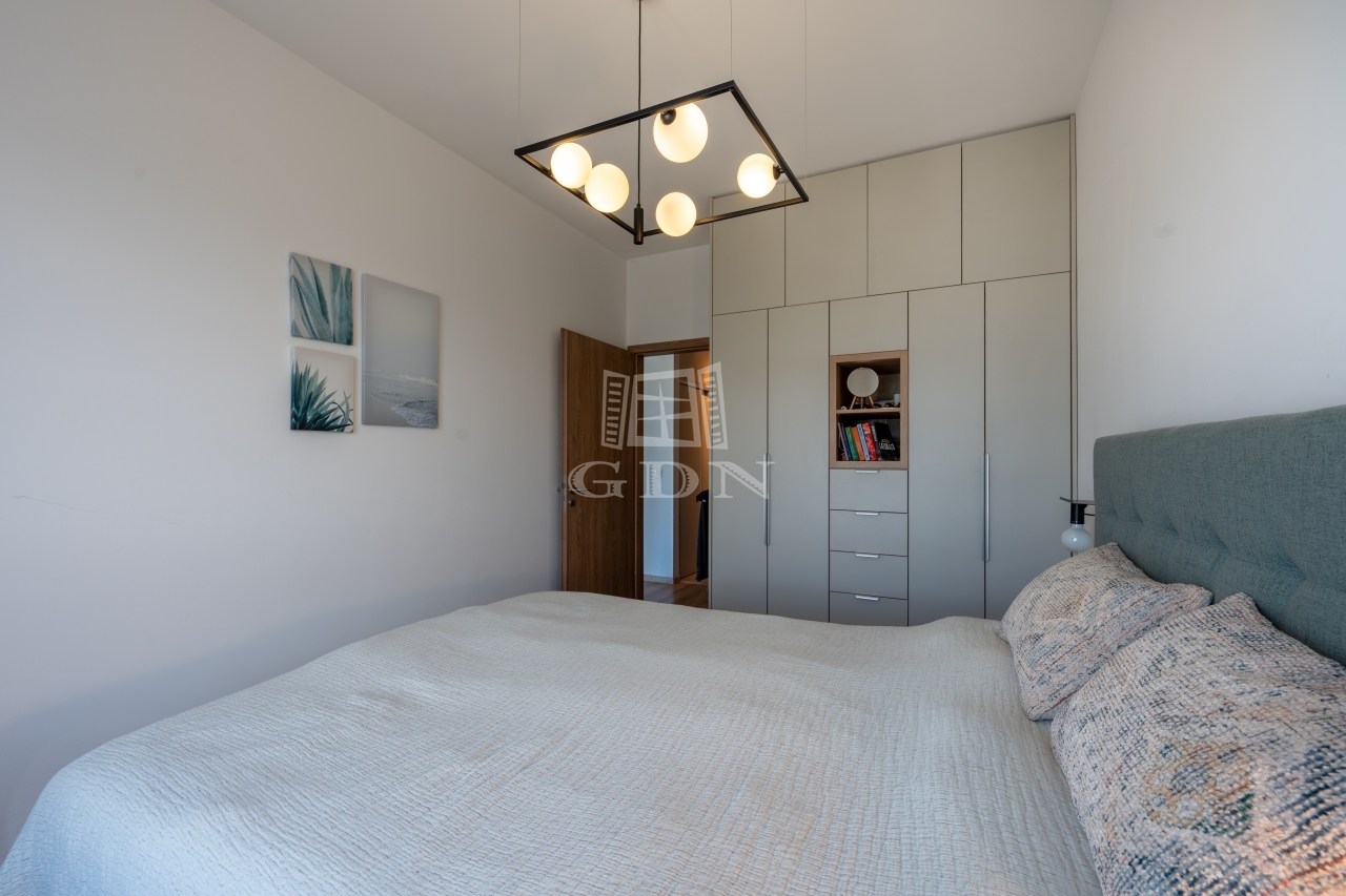 Szoba, előszoba, fürdőszoba beépített bútorokkal.