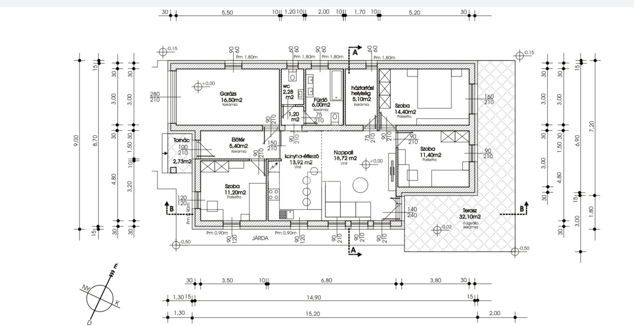 A 32 m²-es nappali–konyha–étkező a ház központja: tágas, jól berendezhető, közvetlen kapcsolattal a teraszhoz. A három külön nyíló szoba ideális családi elrendezést biztosít, míg a háztartási helyiség és a külön WC a praktikumot erősíti.