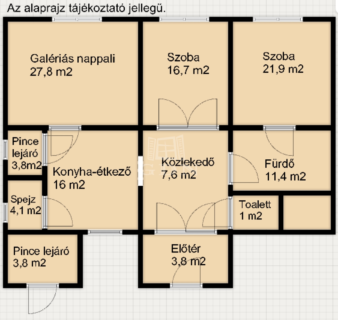 Az otthon helyet ad egy előtérnek, egy közlekedőnek, egy konyha-étkező együttesnek, az onnan nyíló spejznek, a mosókonyhaként használt pince lejárónak, galériás nappalinak, 2 hálónak, egy zuhanyzóval, sarokkáddal és toalettel felszerelt fürdőnek, valamint plusz egy külön helyiségben található toalettnek.