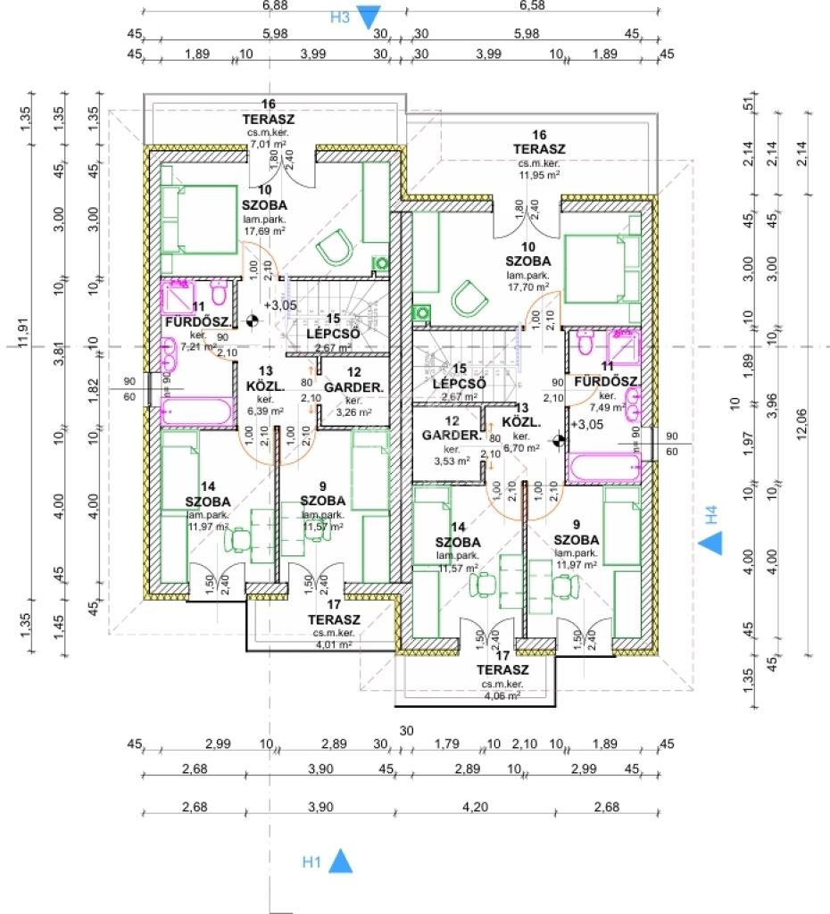 Az emeleten 3 hálószoba, gardrób, fürdőszoba és erkélyek biztosítják a privát teret.
