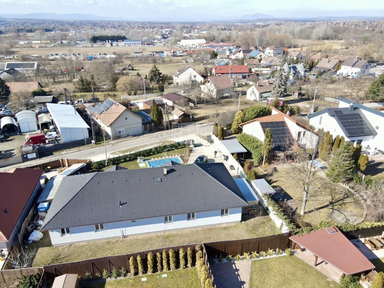 Az udvaron zsalukőből készült fóliás medencét találunk, hőszivattyús fűtéssel.