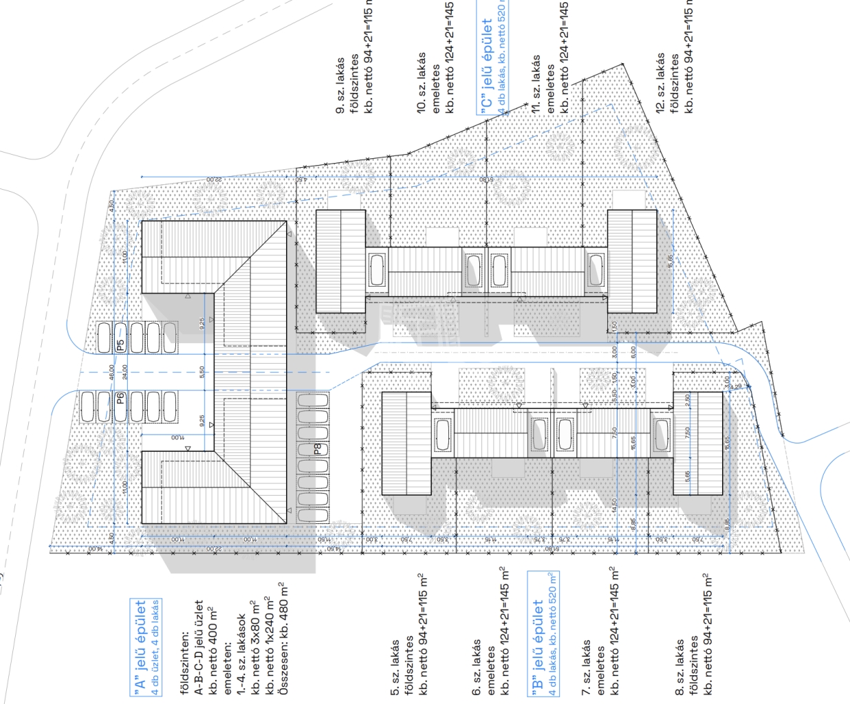 Az "A" épület emeletének jobb oldalára 1 db 240 nm-es nagyméretű lakás lett tervezve. Igény esetén 3 kisebb, különálló lakássá alakítható. Az építés során a fűtésrendszer, víz és a villany, lakásonként lesz kialakítva. Minden lakás saját mérőórákkal rendelkezik.