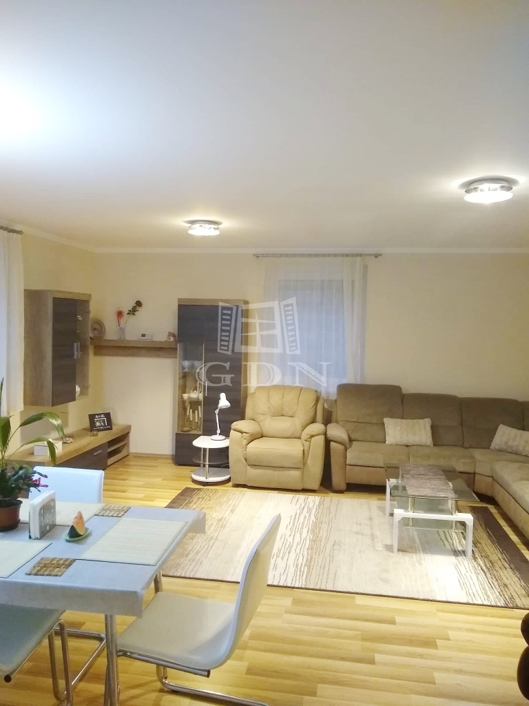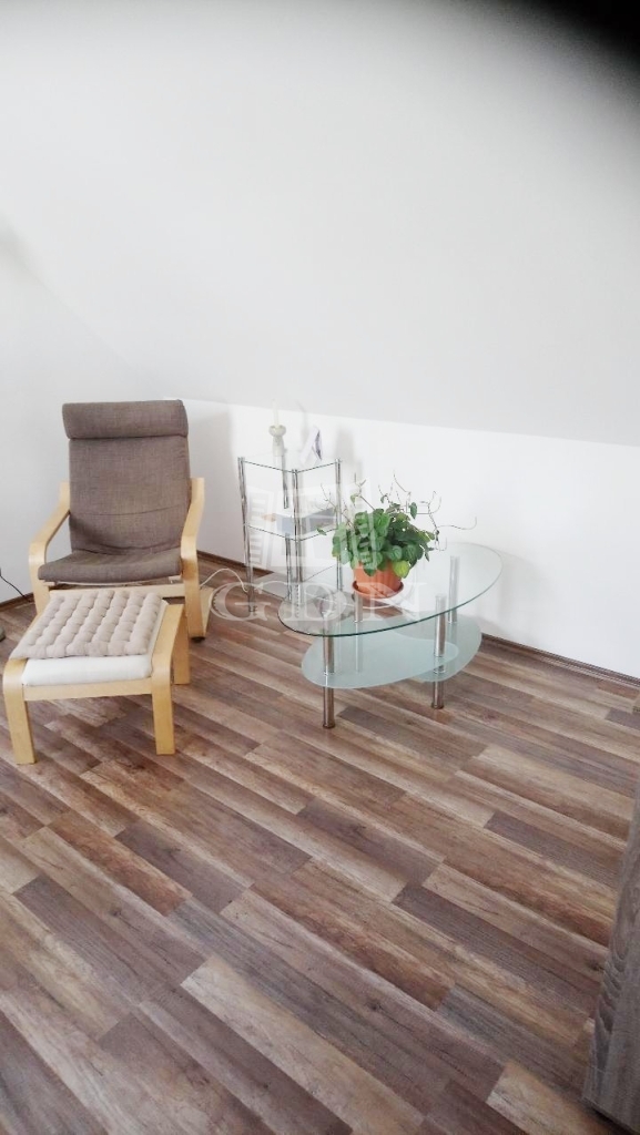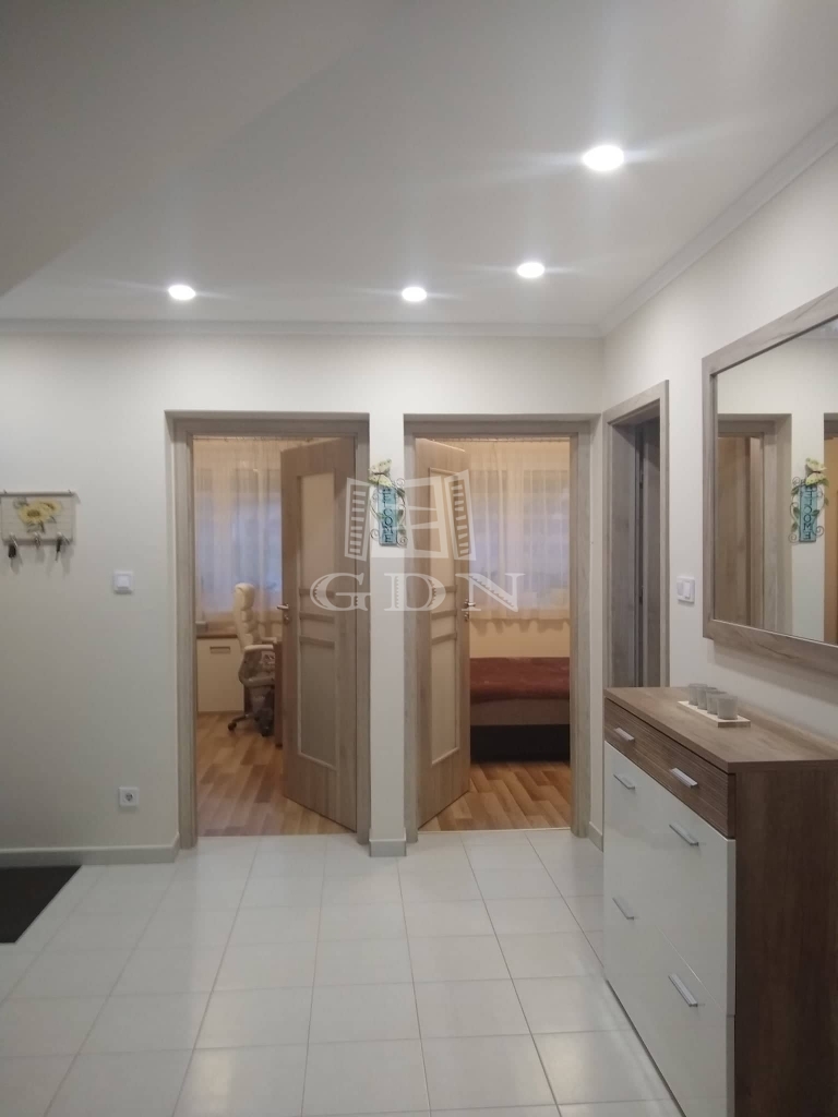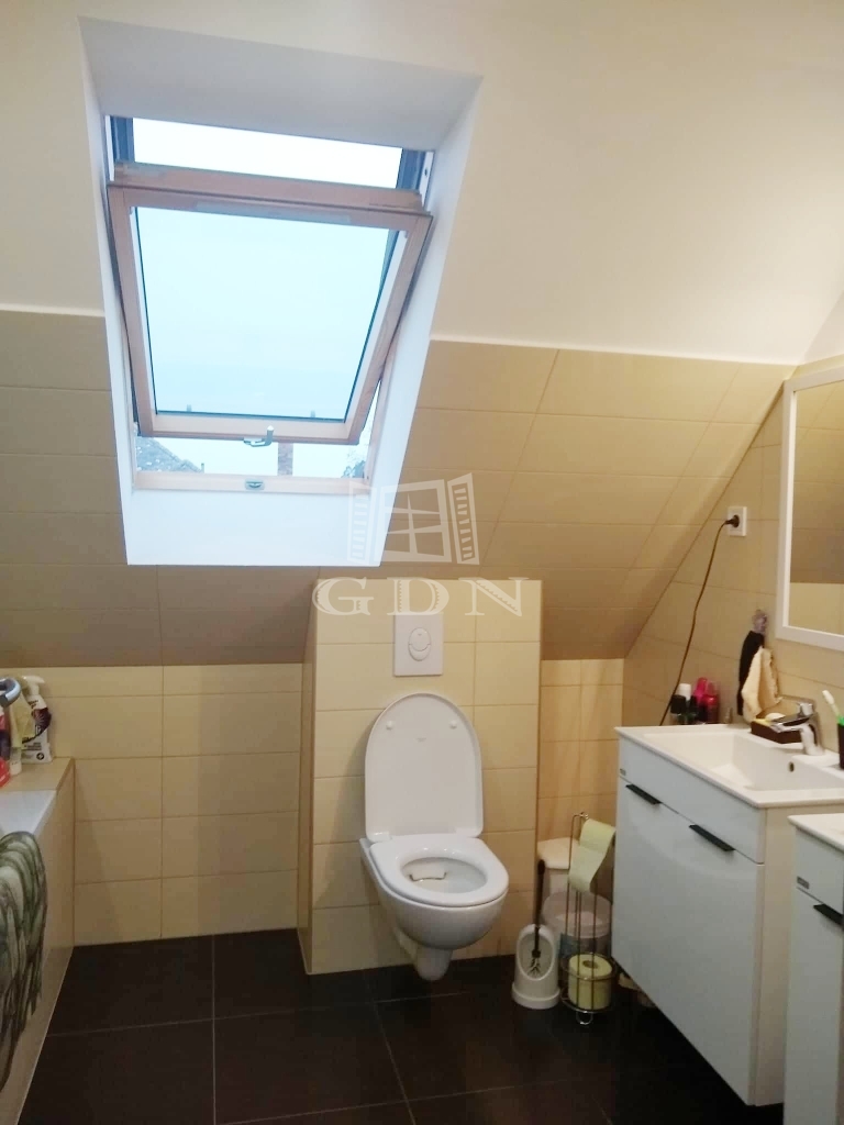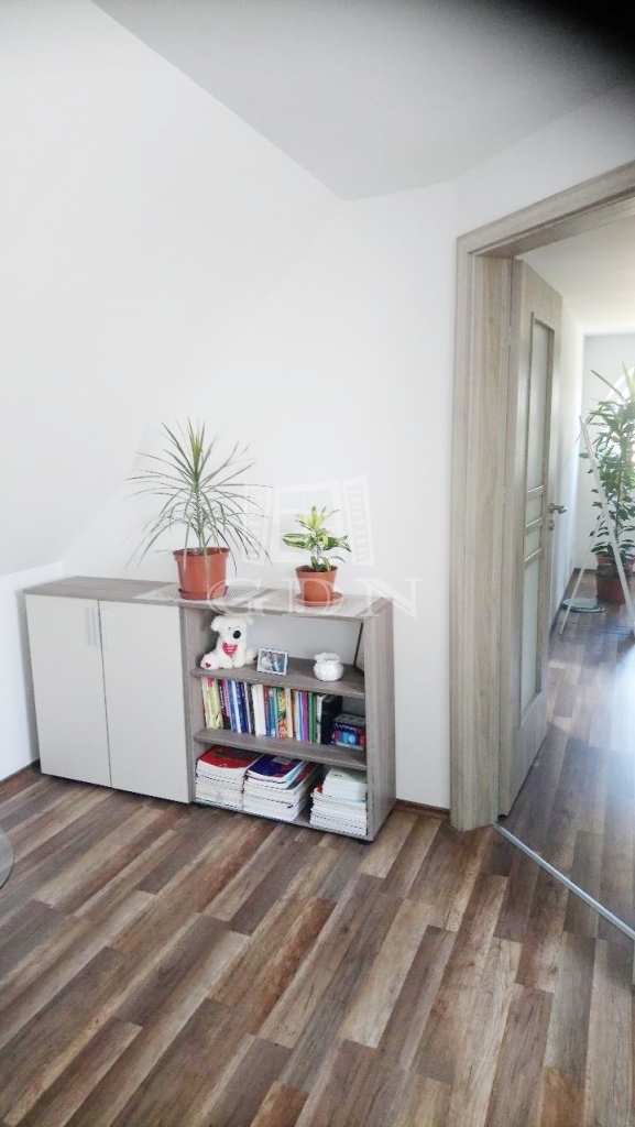 Az alsó szinten egy nappali, konyha, két szoba, tároló, fürdőszoba és wc, míg a felső szinten egy nappali, egy hálószoba gardróbbal és fürdőszoba található. A házhoz garázs, kerti tároló és terasz tartozik.