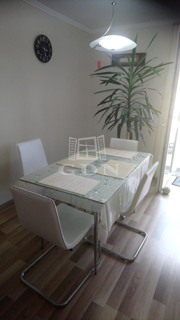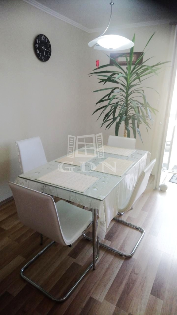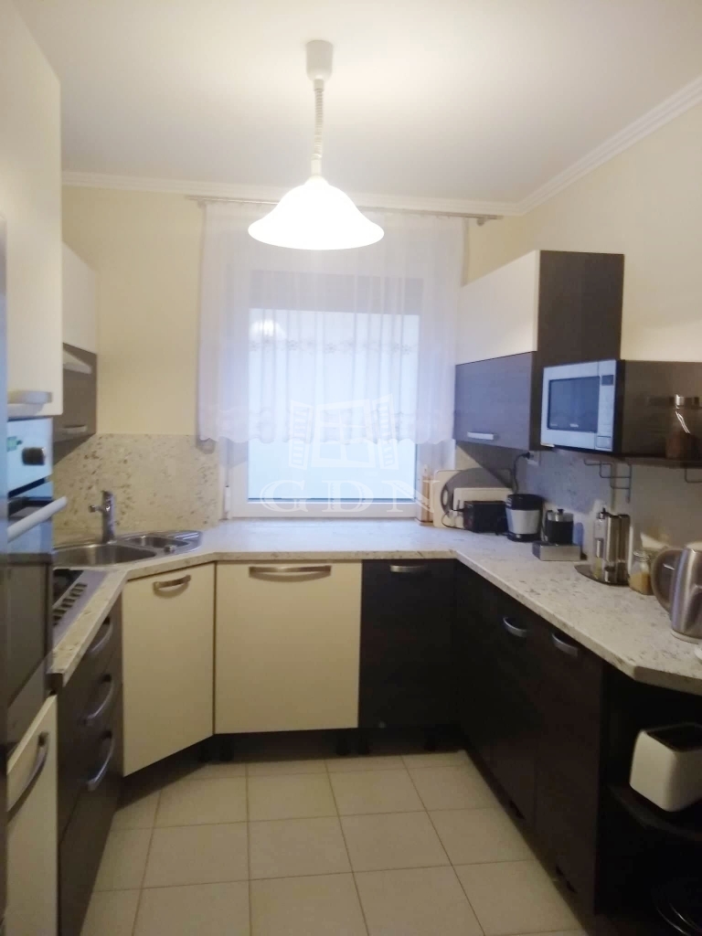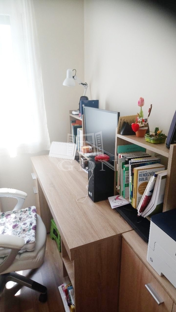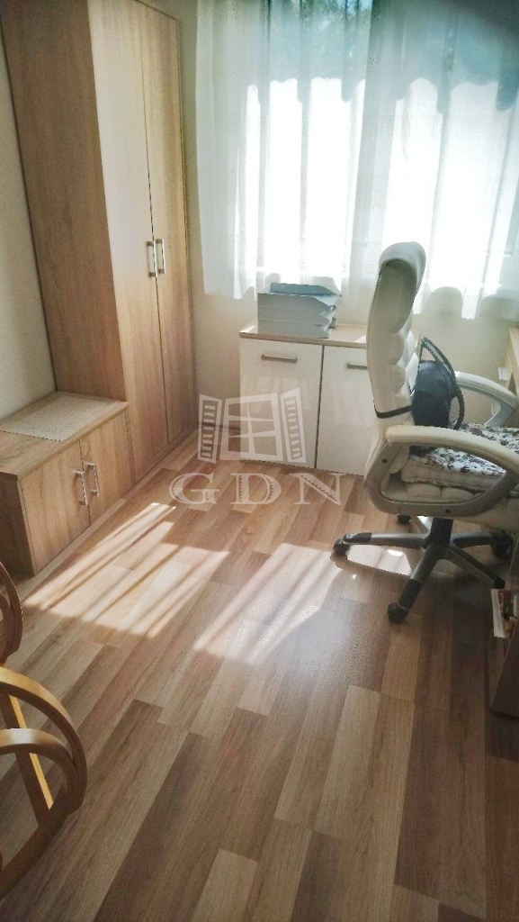 Az alsó szinten egy nappali, konyha, két szoba, tároló, fürdőszoba és wc, míg a felső szinten egy nappali, egy hálószoba gardróbbal és fürdőszoba található. A házhoz garázs, kerti tároló és terasz tartozik.