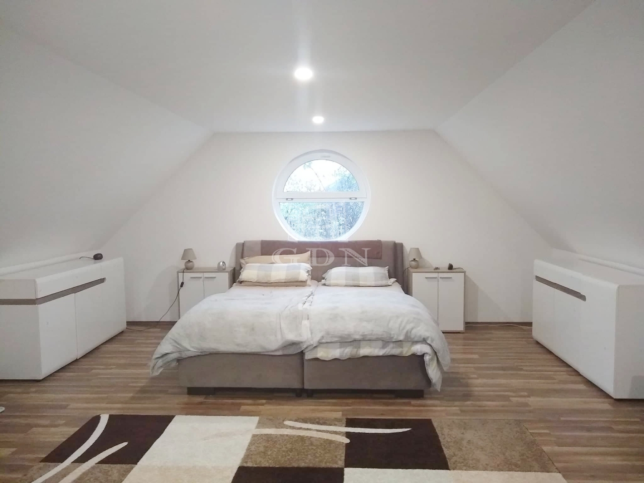 A határtól nem messze, Győr szomszédságában fekszik a 769 m2-es telek, ahol ez a 136 m2 alapterületű családiház elhelyezkedik.