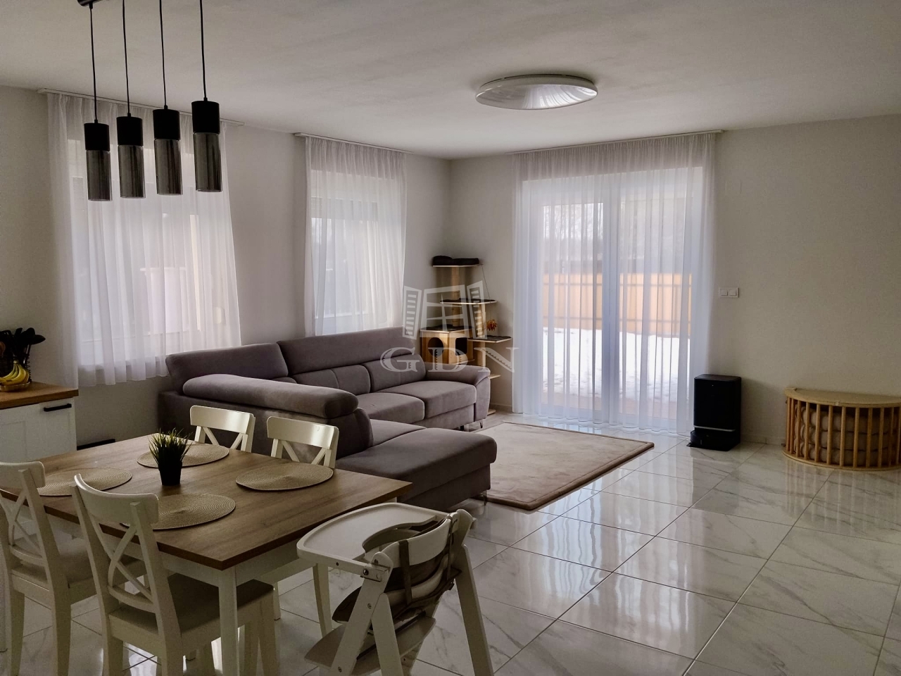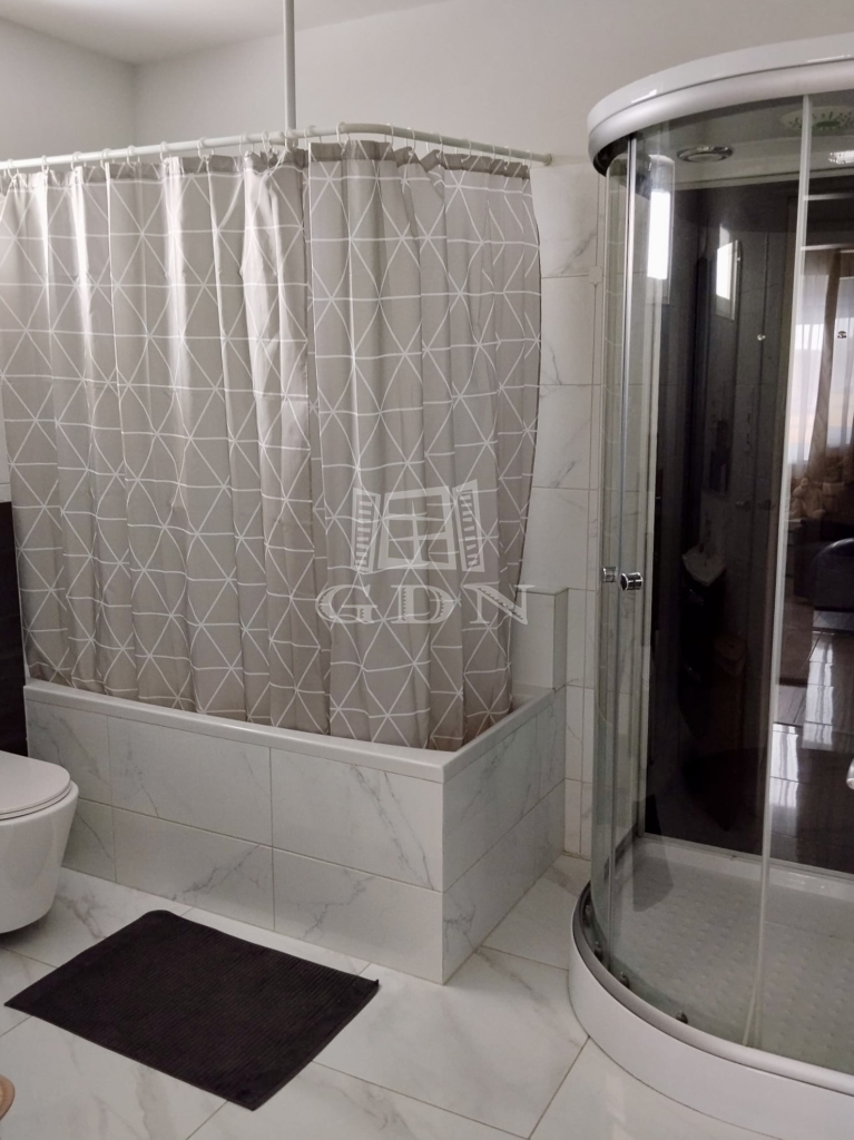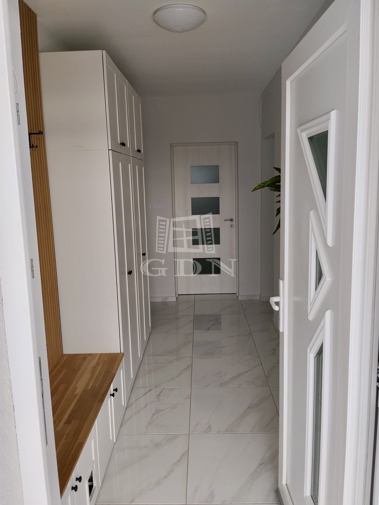 A ház nettó 95,49 négyzetméteres lakóterülettel rendelkezik, amelyet átgondolt, praktikus elrendezés jellemez. A tágas, amerikai konyhás nappali a lakás központi tere, amely természetes fényben gazdag, jól berendezhető, és közvetlen kapcsolatban áll a kerttel. A három külön nyíló szoba kényelmes életteret biztosít akár családok számára is. A konyha teljesen gépesített, a beépített bútorokkal és eszközökkel együtt a vételár részét képezi, ahogyan a fürdőszoba berendezése és a zuhanykabin is. A padlástér további praktikus tárolási lehetőséget kínál.