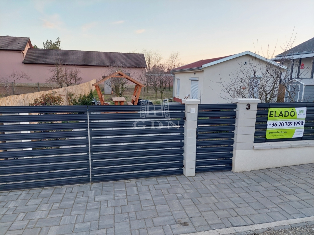 Az előkert részén helyezkedik el egy új kerti szerszámtároló, illetve itt lehet létrehozni egy kis konyhakertet is. A szépen gondozott hátsó kertben fiatal gyümölcsfák találhatók és ezen a területen, szükség esetén a ház további bővítése is lehetséges. A környék kifejezetten csendes, nyugodt kertvárosias. Bár az ingatlan előtt jelenleg még murvával borított út található, de a két szomszédos utca felől aszfaltozott úton közelíthető meg.