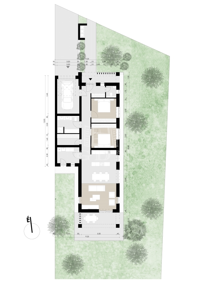 A lakóegység hasznos alapterülete 123 m², és modern, jól átgondolt elrendezéssel rendelkezik: előszoba, közlekedő, két hálószoba, étkezős konyha, világos nappali, fürdőszoba, külön WC, gardrób, háztartási helyiség, nagy terasz, valamint garázs.